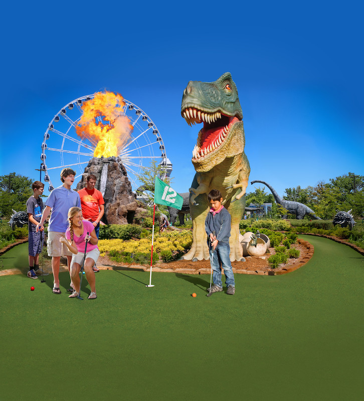 As one of the nation's largest miniature golf courses, Dinosaur Adventure Golf features two 18-hole courses: 'Raptor' and 'T-Rex', 3 distinct decorative ponds with fast-moving rapids and bubblers and a 50 foot high "active" steam-erupting volcano that lets golfers play directly through a realistically eerie, cavernous volcanic interior.